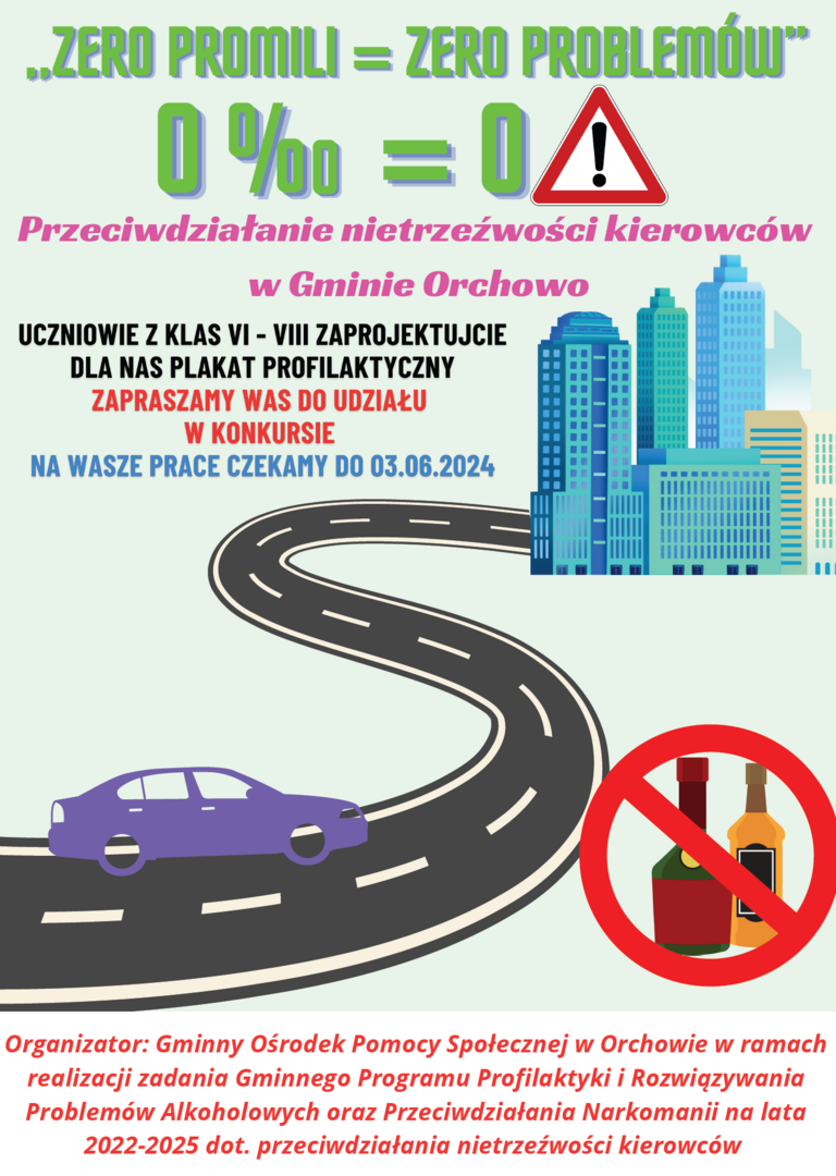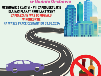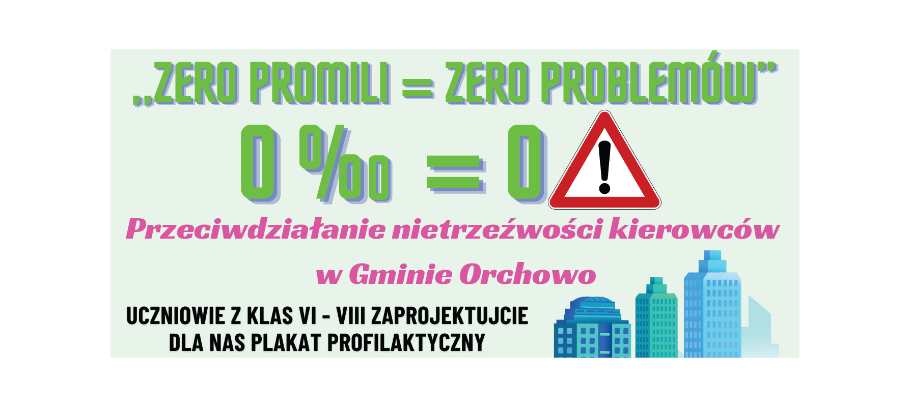 Serdecznie zapraszamy uczniów klas VI-VIII uczęszczających do szkół podstawowych na terenie Gminy Orchowo do uczestnictwa w konkursie profilaktycznym pt. „ZERO PROMILI=ZERO PROBLEMÓW”.