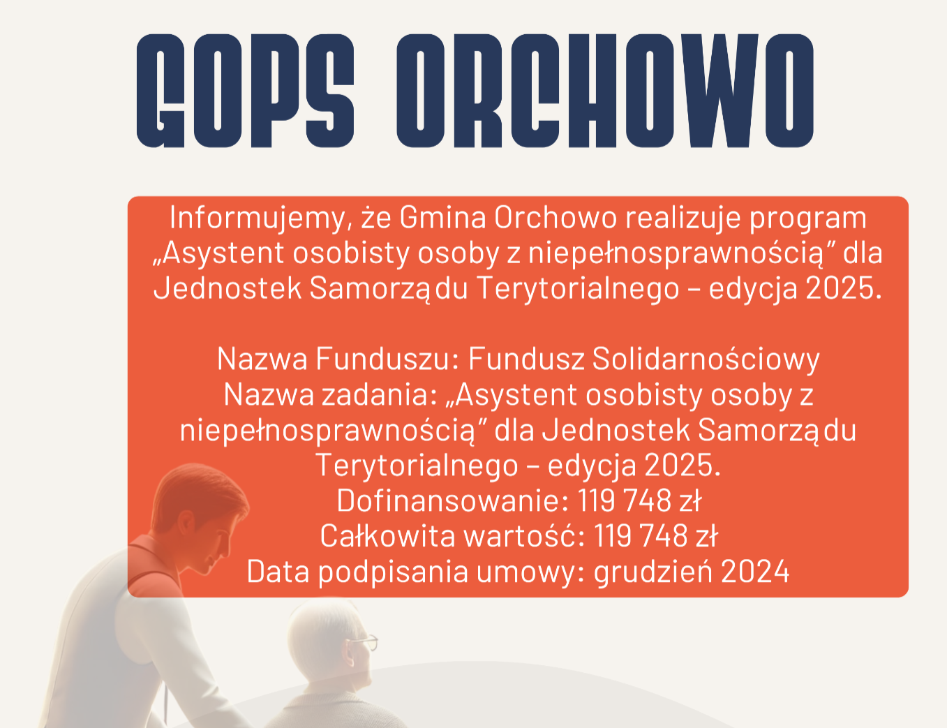 Gmina Orchowo informuje, iż pozyskała dofinansowanie ze środków Funduszu Solidarnościowego na realizację Programu Ministra Rodziny, Pracy i Polityki Społecznej „Asystent Osobisty Osoby z Niepełnosprawnością” dla Jednostek Samorządu Terytorialnego – edycja 2025 o wartości 119 748 zł stanowiącej całkowity koszt zadania.